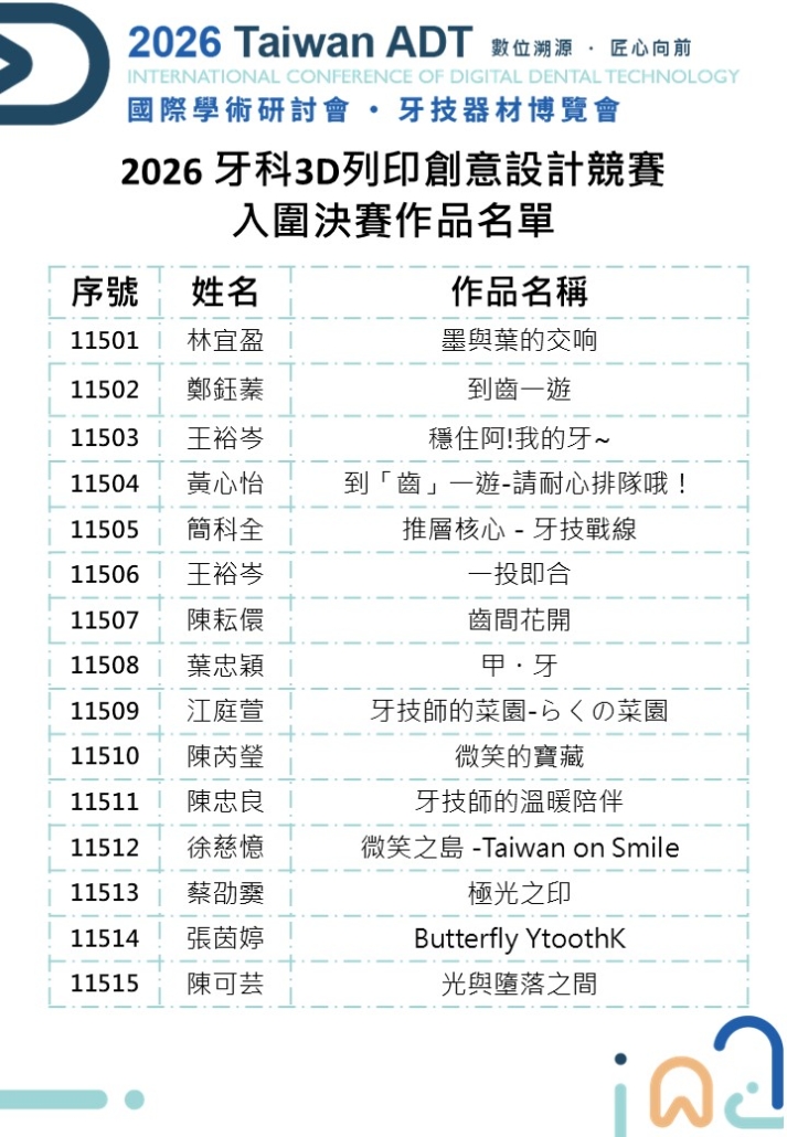【2025 TAIWAN ADT 牙科3D列印創意設計競賽】入圍決賽名單