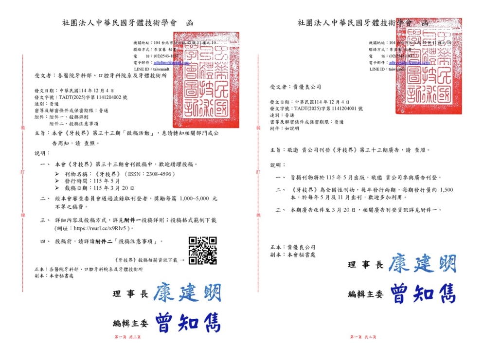 【牙技界33期】招商&徵稿中2025.12.5/在: 最新消息, 秘書處公告新一期《牙技界》第33期自即日起正式開放徵稿與廣告招商,相關資訊請詳閱公函。 📌 截稿日期:民國115年3月20日(星期五) 📄 完整公函下載: 牙技界第33期廣告招商函 牙技界第33期徵稿函 📞 秘書處聯繫 LINE ID:taiwanadt https://tadt.org.tw/wp-content/uploads/2025/12/牙技界33期徵稿招商.jpg 900 1300 dentaltadt /wp-content/uploads/2022/09/0907-logo.png dentaltadt2025-12-05 16:30:522025-12-05 16:32:12【牙技界33期】招商&徵稿中